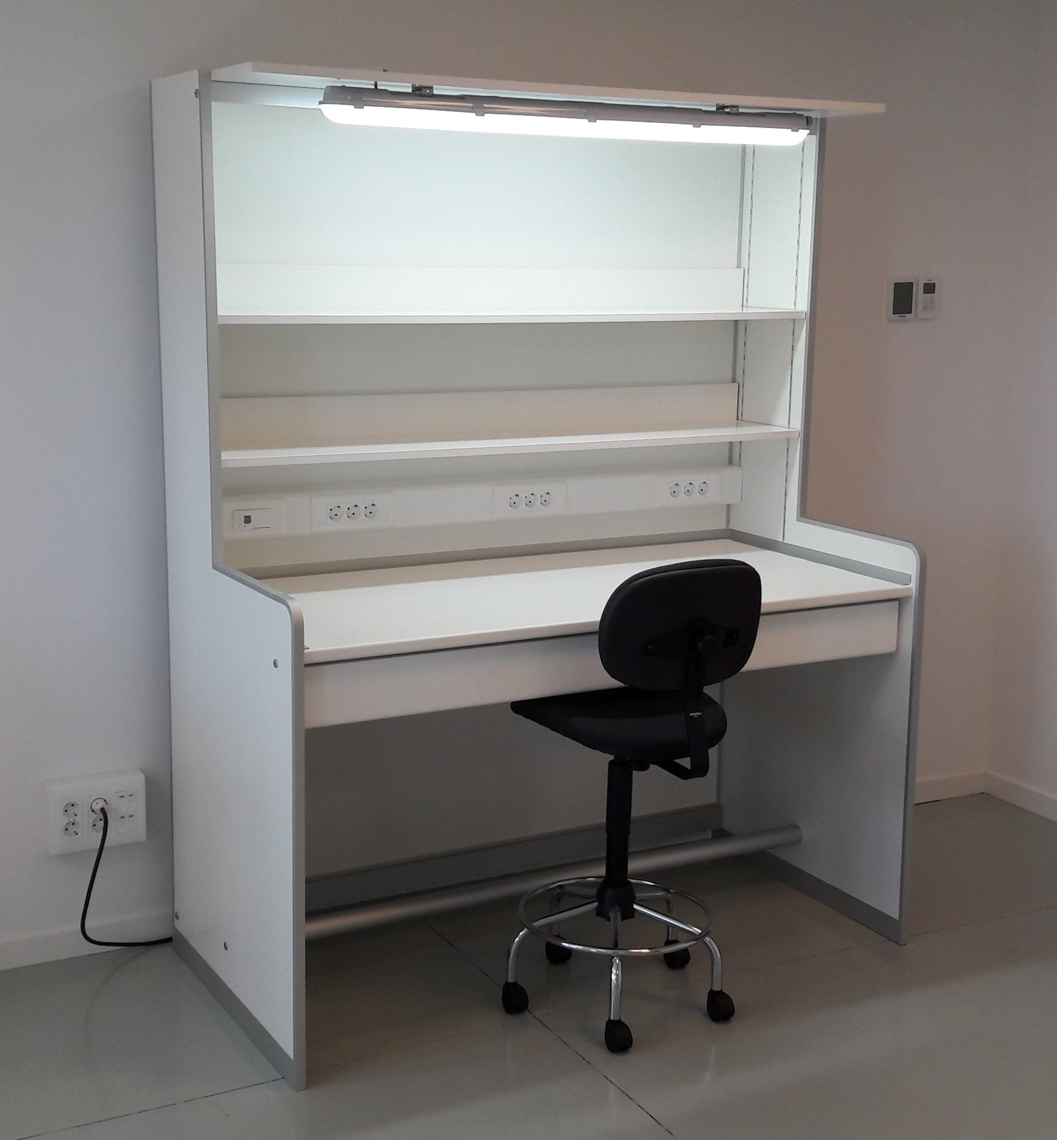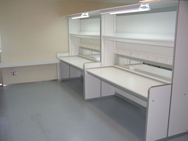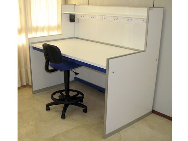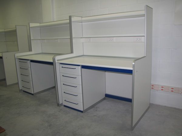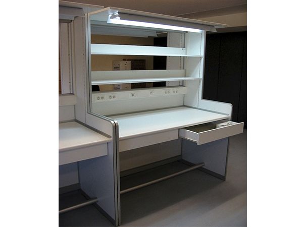 Fabricados a medida, con encimera de estratificado postformado. Estantes fijos o graduables en altura. Muebles bajo encimera con puertas batientes o correderas, o con cajones. Tomas eléctricas en torretas, o en canaleta sobre la trasera.