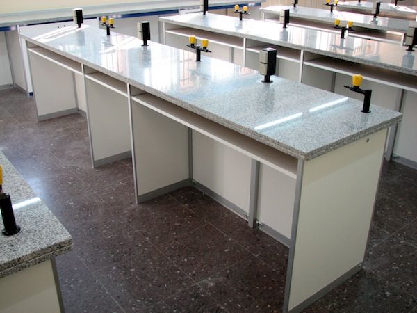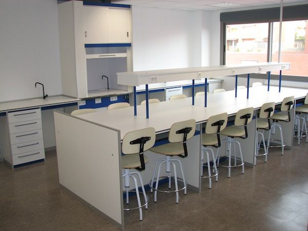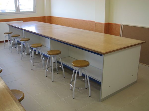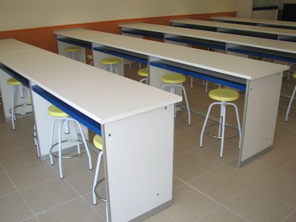 Mesas para alumnos, fabricadas a medida, con repisa para libros. Mesas para profesor. Mesas con fregadero. Armarios para material. Taburetes.