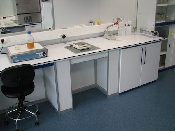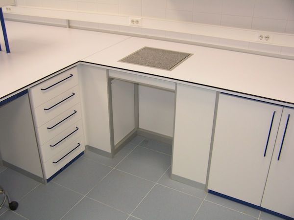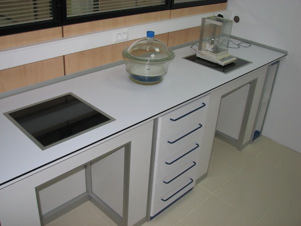 Mesas antivibratorias independientes o integradas en una mesa mural o central. Con una armadura interna de tubo de acero de 40 x 40 mm, encimera de palastro de 10 mm. y amortiguadores/niveladores de 60 mm. Ø. Base de granito, a medida de la balanza, sobre amortiguadores/niveladores de 45 mm.
