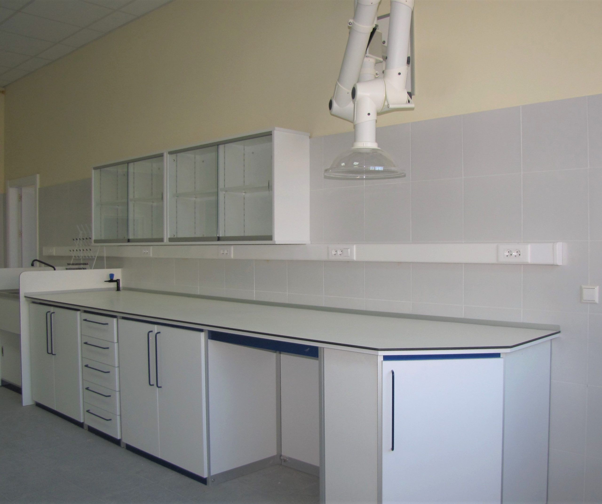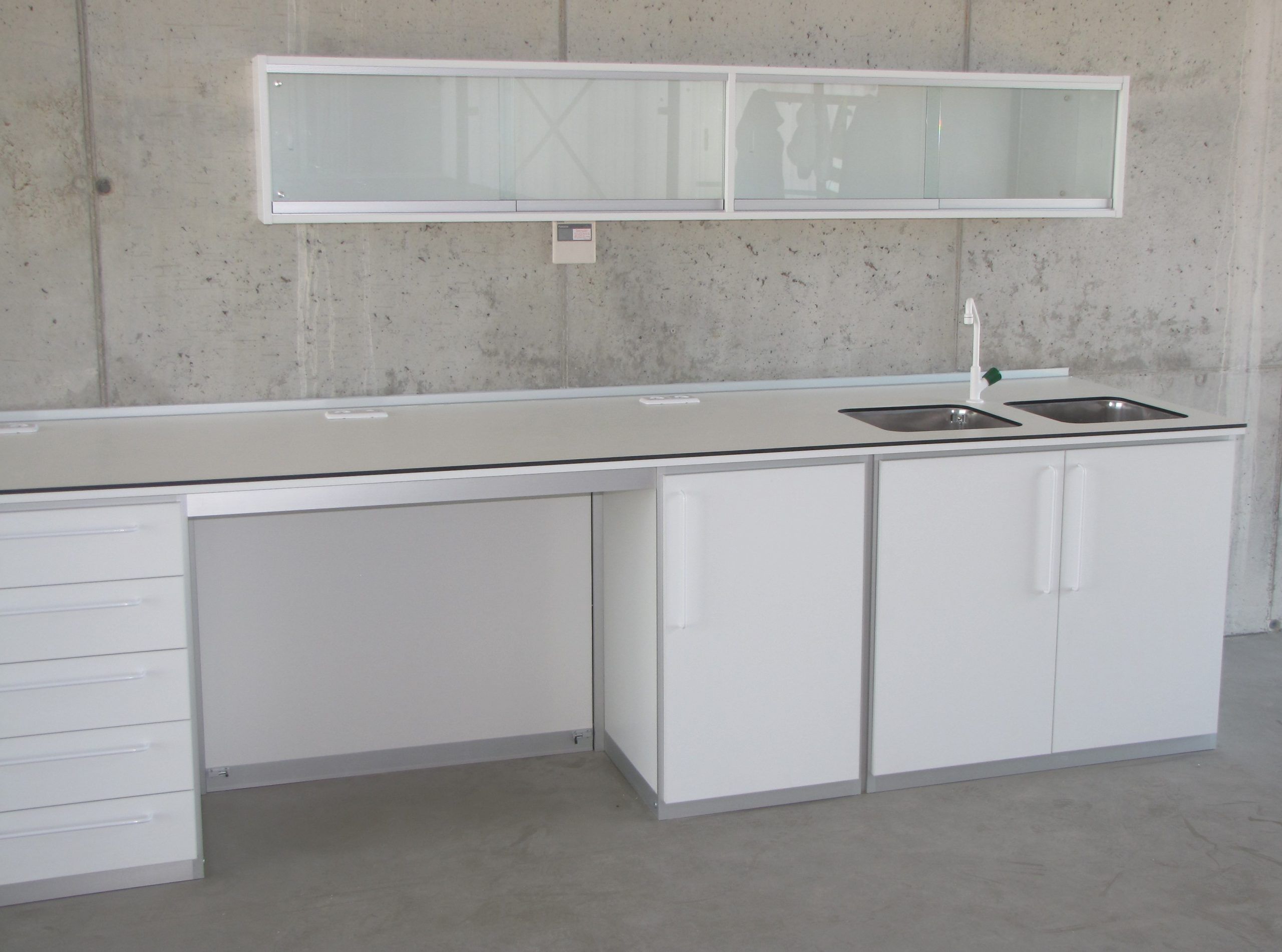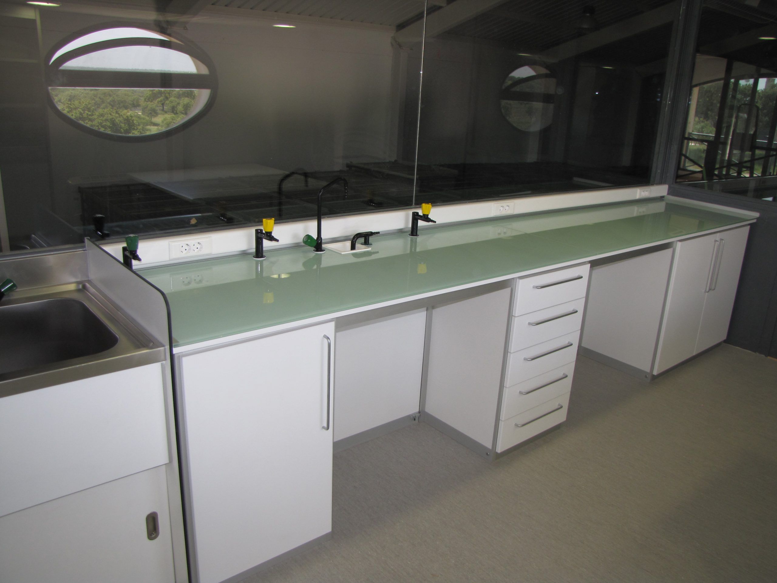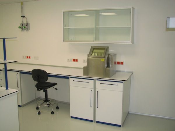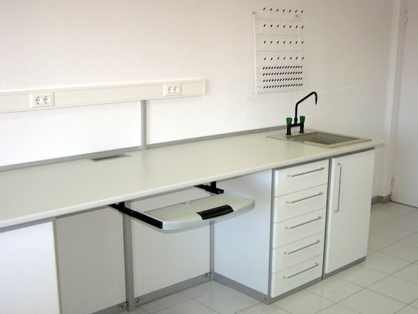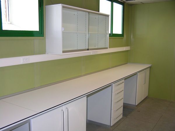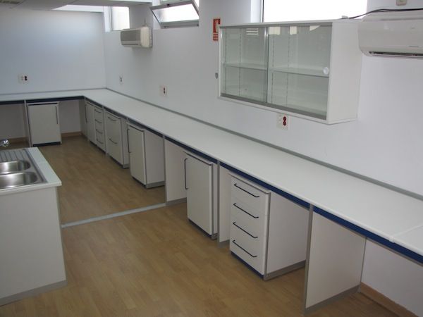 Mesas Murales fabricadas a medida, con encimera de estratificado, resinas, gres, granito, o acero inoxidable, según el trabajo que se vaya a desarrollar sobre ella. Muebles bajo encimera con puertas batientes o correderas, o con cajones. Tomas eléctricas en torretas, o en canaleta fija a la pared Fregaderos de acero inoxidable o de polipropileno, con grifería especial para laboratorio. Dependiendo de sus necesidades.