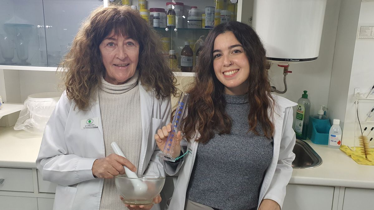 Su hija Irene, sentada a su lado izquierdo, la mira con admiración y escucha atentamente. La joven siguió los pasos de su madre y de su abuela, porque se crio en la botica y le gustaba el oficio. «Ya desde bien chica fue lo que veía en casa», apunta Mellado. Y expone que «al terminar los estudios de Farmacia, cursé asimismo el grado de Nutrición y Dietética. Después me fui a Madrid a trabajar y me volví para aquí con el tema de la pandemia del covid a ayudar a mi madre».
